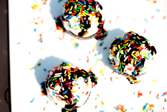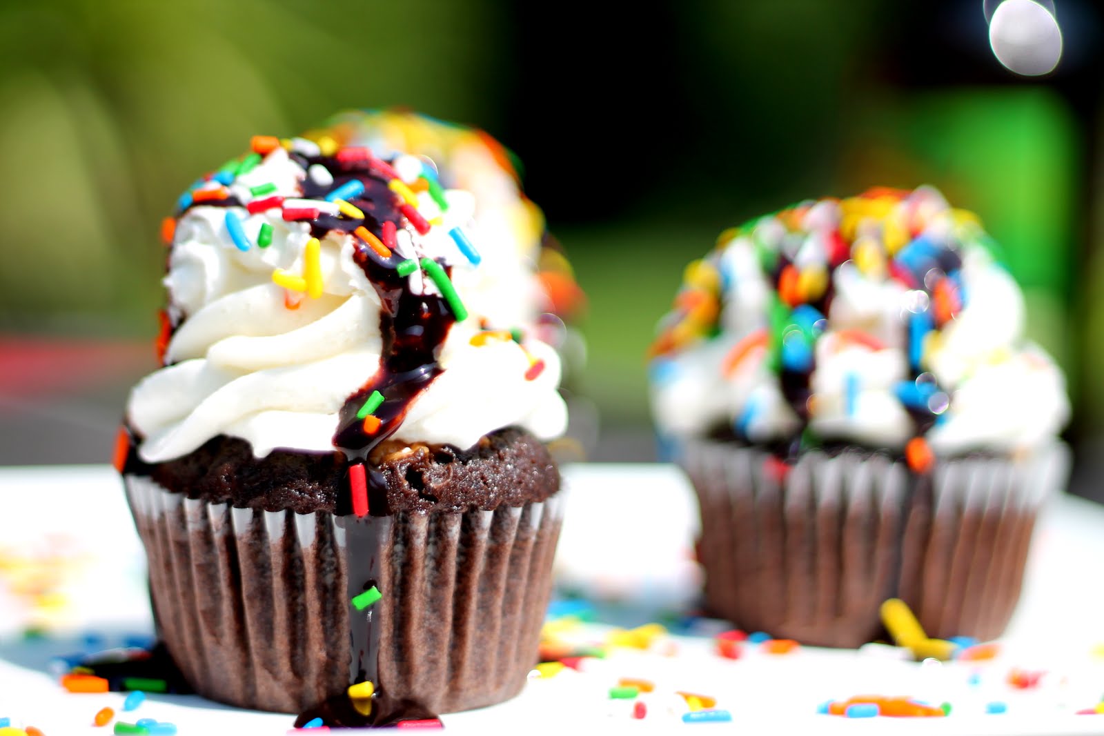 Use a large frosting tip to pipe frosting on to cooled cupcakes. Top frosting with whipped cream, chocolate syrup and sprinkle with lots of rainbow jimmies!
