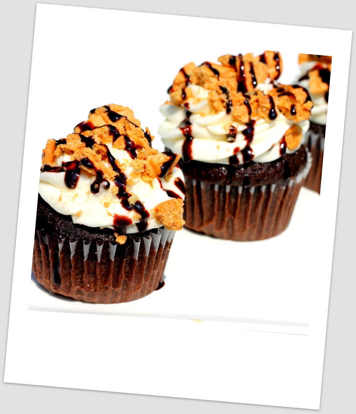 Beat 2 softened sticks of butter with 2 boxes of confectioner’s sugar, and add 1 t. vanilla. Use a large frosting tip to pipe frosting on to cooled cupcakes. Sprinkle crushed nutterbutter cookies on top of frosting & drizzle with chocolate syrup! Delish!
