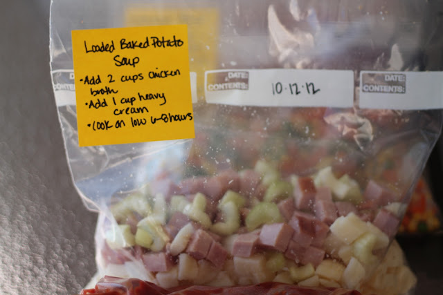 I print out all my recipes ahead of time and make a shopping list (you can find this below).  I chopped all the vegetables and brown the ground beef for the Taco Chili.  I then label each bag with directions, cook times, additional ingredients, etc.